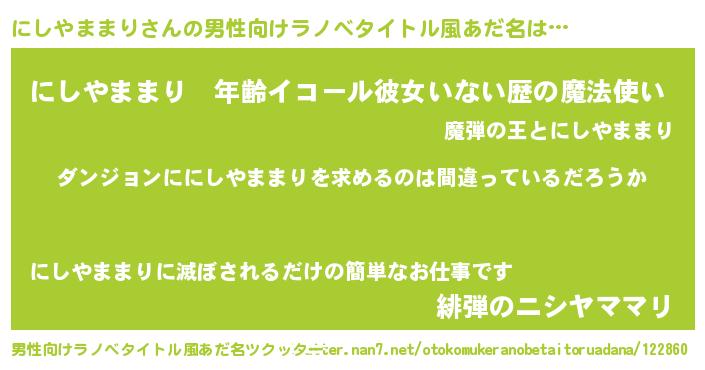 | 女子向けラノベタイトル風あだ名 | 『にしやままりは平凡を望む』 |