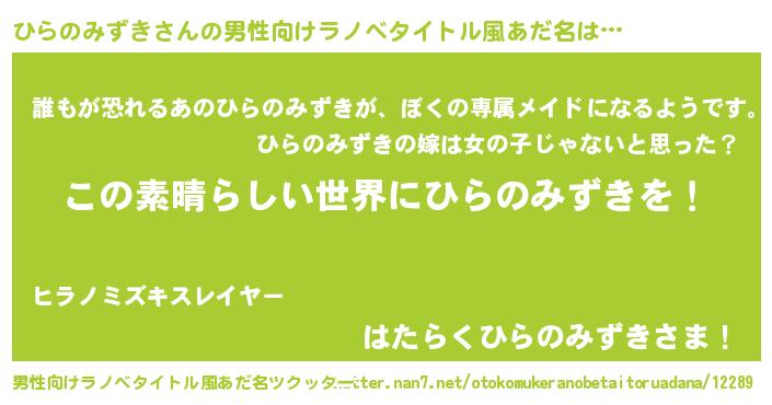 | 女子向けラノベタイトル風あだ名 | 『乙女ゲームの破滅フラグしかない悪役ひらのみずきに転生してしまった…』 |