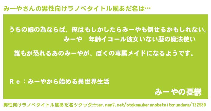 | 胡散臭い通販商品みたいなあだ名 | 『来世でも幸せになれる水素水…その名も「みーや」』 |