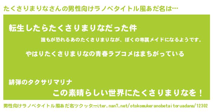 | 女子向けラノベタイトル風あだ名 | 『たくさりまりなの雑貨屋さん』 |