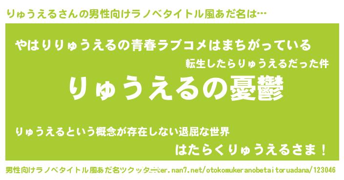 | 女子向けラノベタイトル風あだ名 | 『(仮)りゅうえるのやんごとなき事情』 |