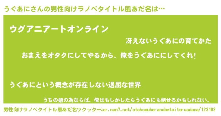 | 女子向けラノベタイトル風あだ名 | 『うぐあに夫妻のなれそめ』 |