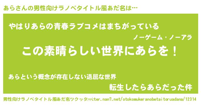 | 女子向けラノベタイトル風あだ名 | 『乙女ゲームの破滅フラグしかない悪役あらに転生してしまった…』 |