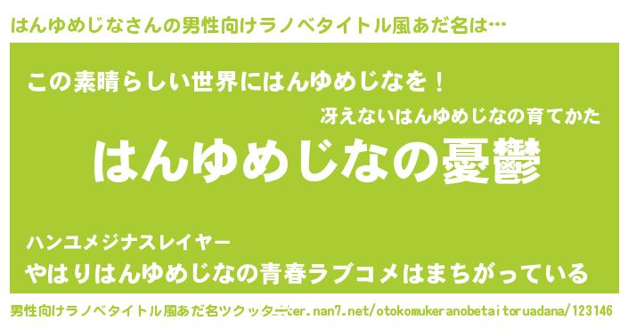 | 女子向けラノベタイトル風あだ名 | 『(仮)はんゆめじなのやんごとなき事情』 |