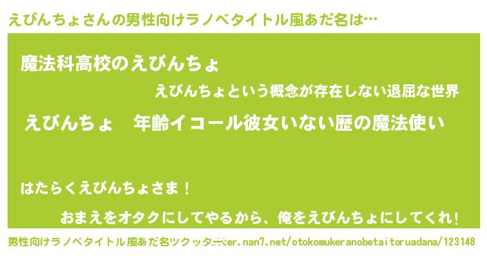 | 女子向けラノベタイトル風あだ名 | 『えびんちょの玉の輿計画!』 |