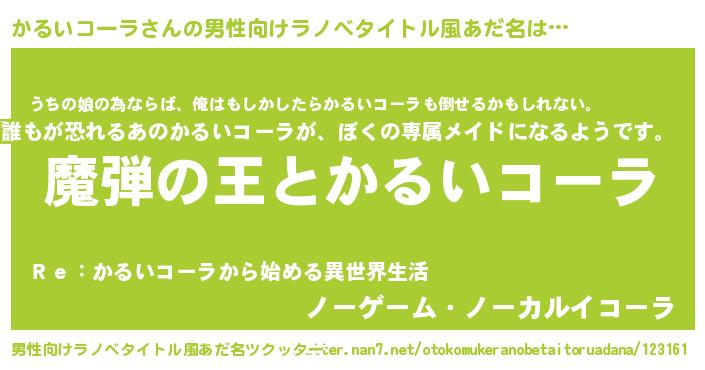 | 女子向けラノベタイトル風あだ名 | 『乙女ゲームの破滅フラグしかない悪役かるいコーラに転生してしまった…』 |