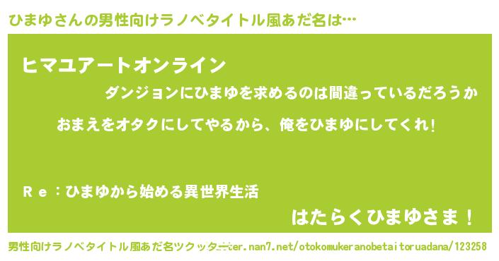 | 女子向けラノベタイトル風あだ名 | 『ひまゆ夫妻のなれそめ』『闇のひまゆ』 |