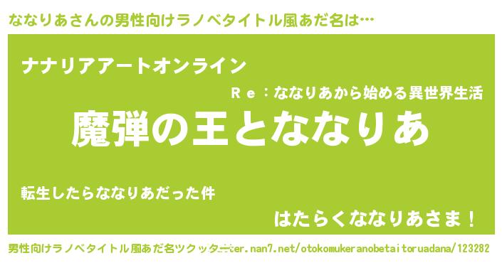 | 女子向けラノベタイトル風あだ名 | 『ななりあが死なない童話 林檎のななりあの診療簿』 |