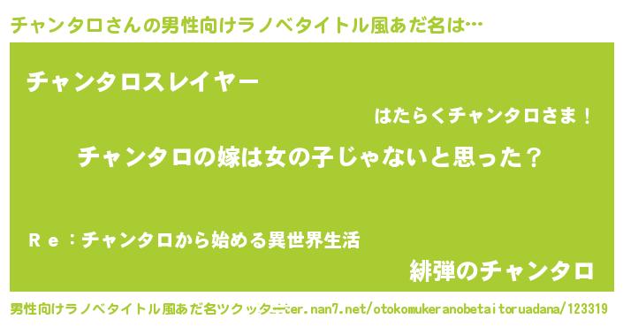 | 女子向けラノベタイトル風あだ名 | 『チャンタロの卵を拾いまして』 |
