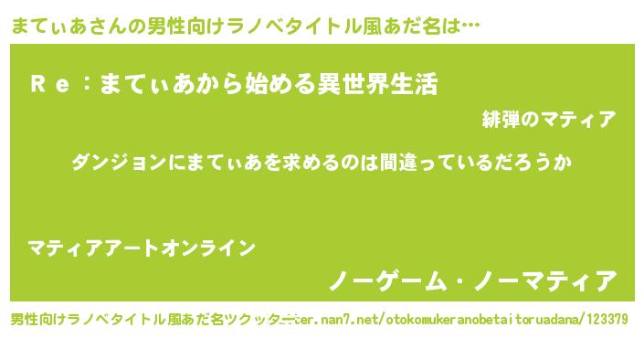 | 女子向けラノベタイトル風あだ名 | 『まてぃあは平凡を望む』 |