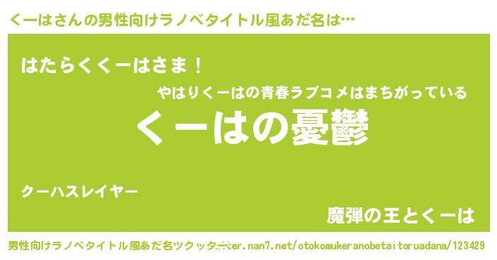 | 女子向けラノベタイトル風あだ名 | 『くーは姫と円卓の騎士』 |