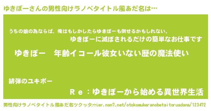 | 女子向けラノベタイトル風あだ名 | 『ゆきぼーの玉の輿計画!』 |