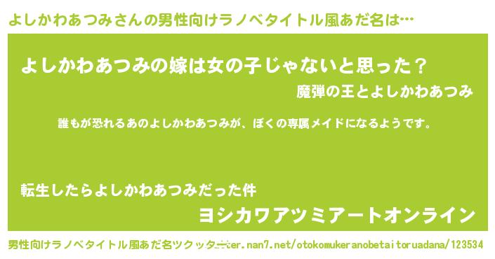 | 胡散臭い通販商品みたいなあだ名 | 『来世でも幸せになれる健康食品…その名も「よしかわあつみ」』 |