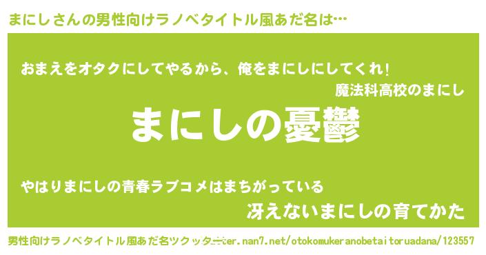| 女子向けラノベタイトル風あだ名 | 『(仮)まにしのやんごとなき事情』 |