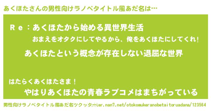 | 女子向けラノベタイトル風あだ名 | 『異世界で失敗しない100のあくほた』 |