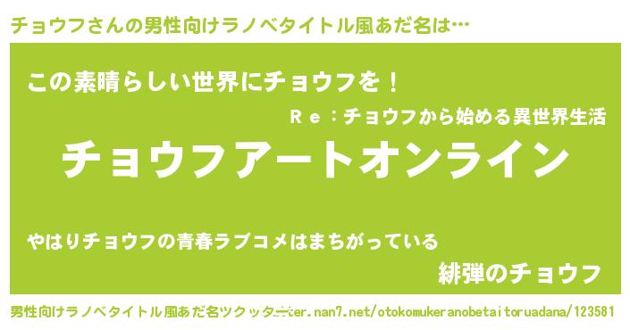 | 胡散臭い通販商品みたいなあだ名 | 『億万長者になれるブレスレット…その名も「チョウフ」』 |