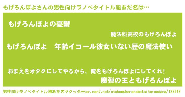 | 女子向けラノベタイトル風あだ名 | 『もげろんぼよの玉の輿計画!』 |