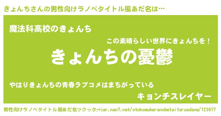 | 女子向けラノベタイトル風あだ名 | 『(仮)きょんちのやんごとなき事情』 |