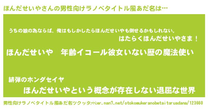 | 女子向けラノベタイトル風あだ名 | 『ほんだせいやの玉の輿計画!』 |