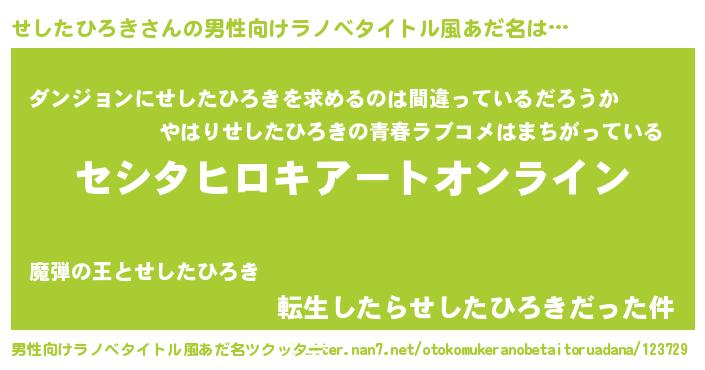 | 胡散臭い通販商品みたいなあだ名 | 『億万長者になれる霊験あらたかなお札…その名も「せしたひろき」』 |
