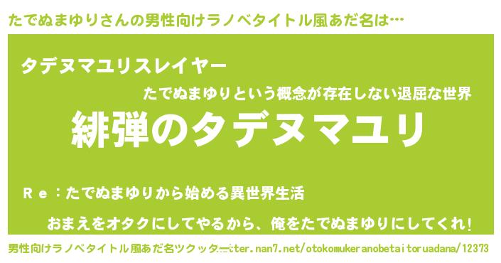 | 女子向けラノベタイトル風あだ名 | 『シンデレラたでぬまゆり家の靴箱館』 |