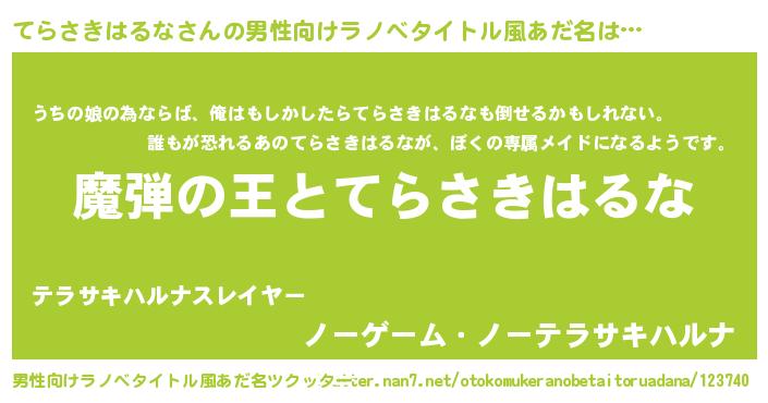 | 女子向けラノベタイトル風あだ名 | 『乙女ゲームの破滅フラグしかない悪役てらさきはるなに転生してしまった…』 |