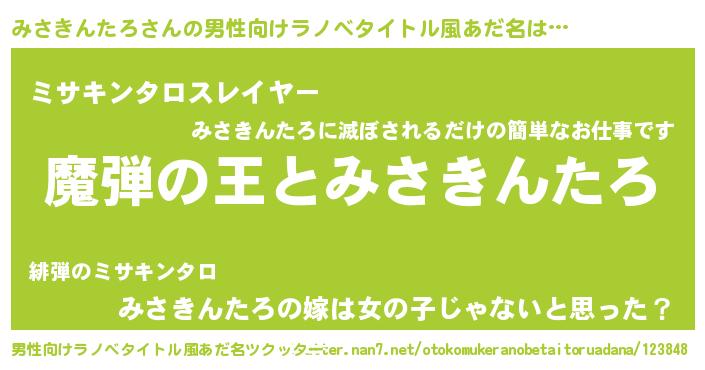| 女子向けラノベタイトル風あだ名 | 『みさきんたろが死なない童話 林檎のみさきんたろの診療簿』 |