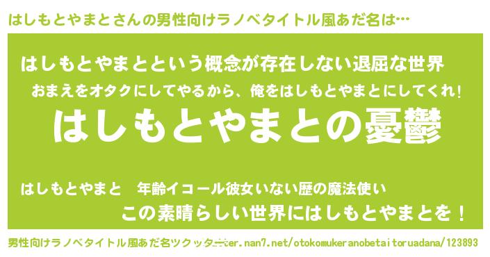 | 胡散臭い通販商品みたいなあだ名 | 『必ず成功する霊験あらたかなお札…その名も「はしもとやまと」』 |