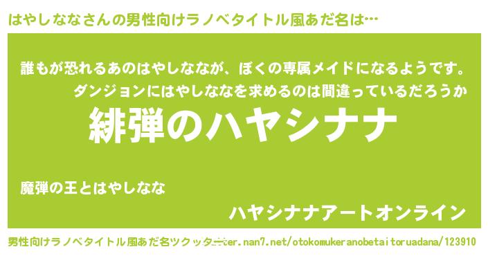 | 胡散臭い通販商品みたいなあだ名 | 『絶対に幸福をもたらす水素水…その名も「はやしなな」』 |