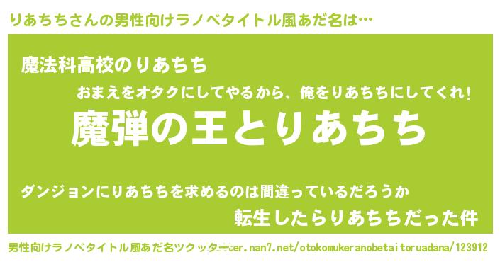 | 女子向けラノベタイトル風あだ名 | 『りあちちが死なない童話 林檎のりあちちの診療簿』 |