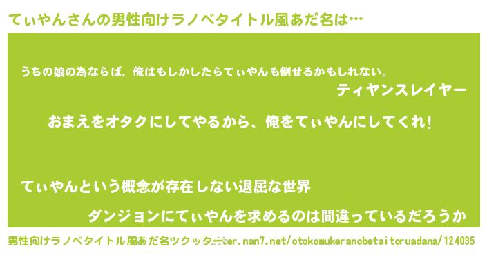 | 女子向けラノベタイトル風あだ名 | 『てぃやん夫妻のなれそめ』 |