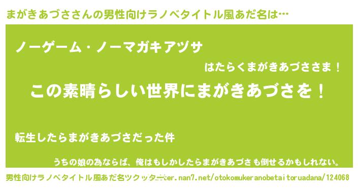 | 意味不明あだ名 | 『住所不定無職まがきあづさ(95歳)』 |