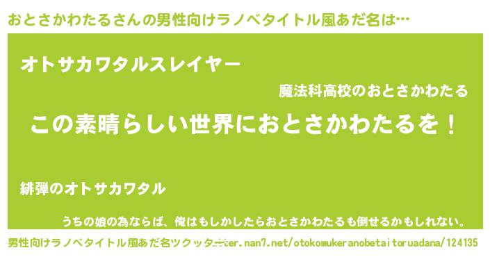 | 女子向けラノベタイトル風あだ名 | 『悪役おとさかわたるに転生したようですが、知った事ではありません』 |