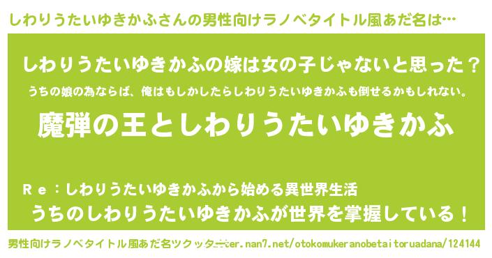 | 女子向けラノベタイトル風あだ名 | 『しわりうたいゆきかふが死なない童話 林檎のしわりうたいゆきかふの診療簿』 |