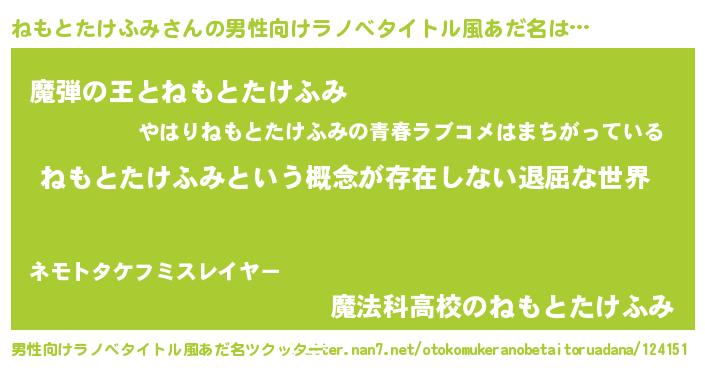 | 女子向けラノベタイトル風あだ名 | 『異世界で失敗しない100のねもとたけふみ』 |