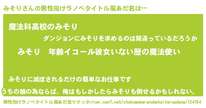 | 女子向けラノベタイトル風あだ名 | 『みそりの玉の輿計画!』 |