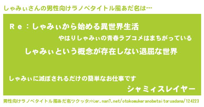 | 胡散臭い通販商品みたいなあだ名 | 『来世でも幸せになれる水素水…その名も「しゃみぃ」』 |