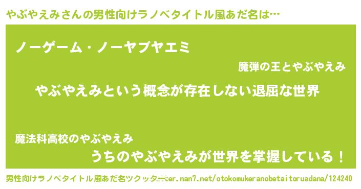 | 女子向けラノベタイトル風あだ名 | 『異世界で失敗しない100のやぶやえみ』 |
