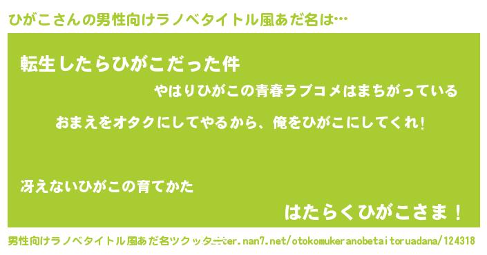 | 女子向けラノベタイトル風あだ名 | 『ひがこ夫妻のなれそめ』 |