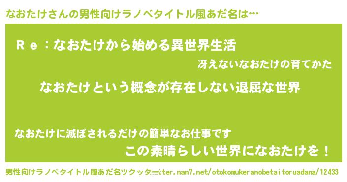 | 女子向けラノベタイトル風あだ名 | 『異世界で失敗しない100のなおたけ』 |