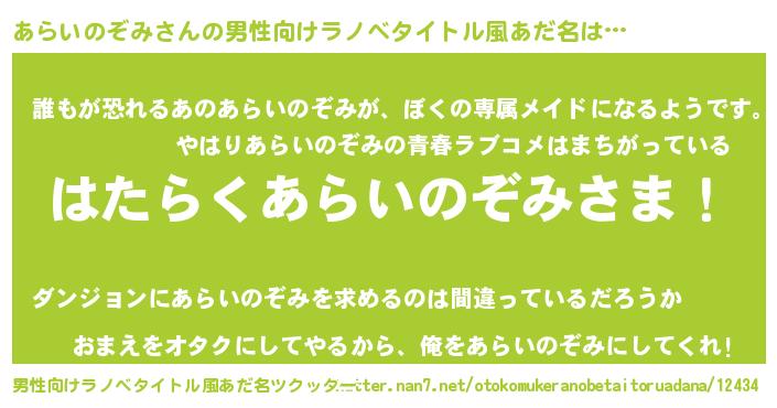 | ヒーロー風カッコイイあだ名 | 『ネオアライノゾミ』『暗黒騎士アラ』 |