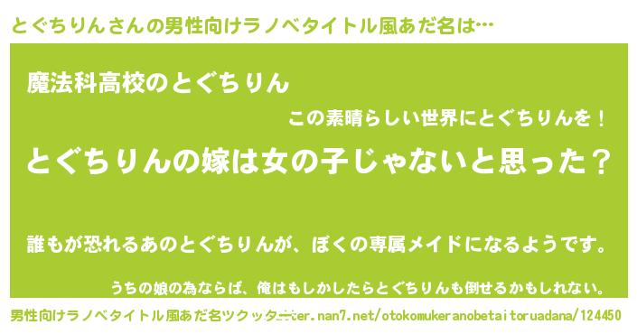 | 女子向けラノベタイトル風あだ名 | 『とぐちりん様がみてる』 |