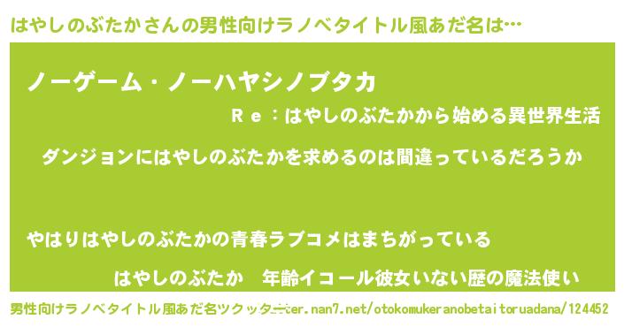 | 女子向けラノベタイトル風あだ名 | 『はやしのぶたかは平凡を望む』 |