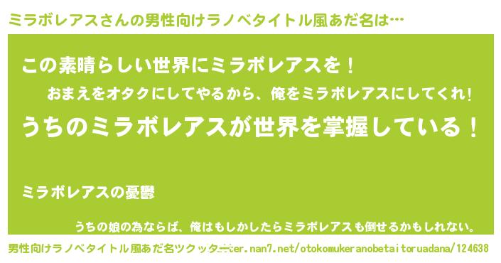 | 胡散臭い通販商品みたいなあだ名 | 『あなたにだけ特別に提供する限定10本のレアな日本酒…その名も「ミラボレアス」』 |