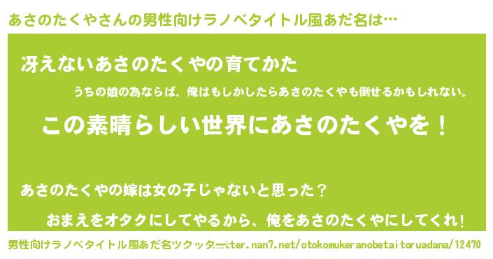 | 女子向けラノベタイトル風あだ名 | 『悪役あさのたくやに転生したようですが、知った事ではありません』 |