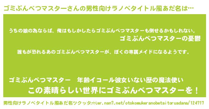 | 胡散臭い通販商品みたいなあだ名 | 『来世でも幸せになれる健康食品…その名も「ゴミぶんべつマスター」』 |