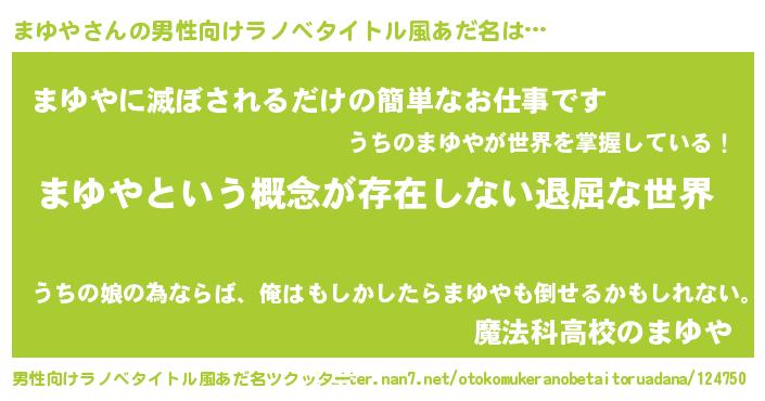 | 女子向けラノベタイトル風あだ名 | 『まゆやの契約王妃』『まゆや伯爵の花嫁』 |