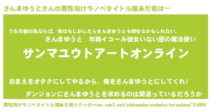 | 女子向けラノベタイトル風あだ名 | 『誰かこのさんまゆうとを説明してください! ~契約から始まるウェディング~』 |