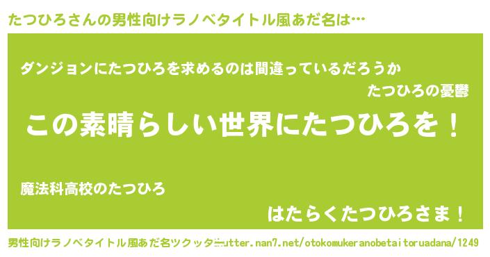 | 女子向けラノベタイトル風あだ名 | 『乙女ゲームの破滅フラグしかない悪役たつひろに転生してしまった…』 |
