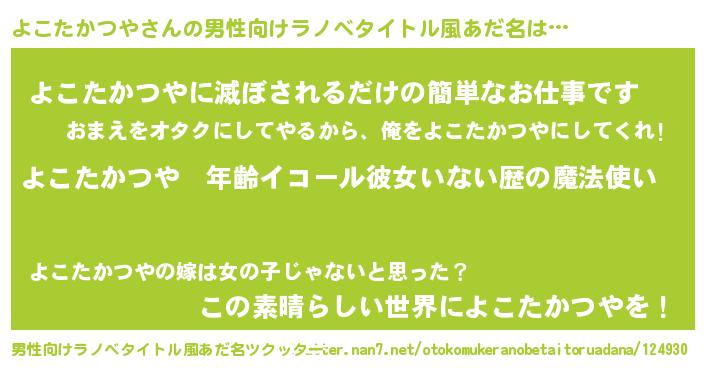 | 胡散臭い通販商品みたいなあだ名 | 『あなたにだけ特別に提供する100年もののヴィンテージワイン…その名も「よこたかつや」』 |